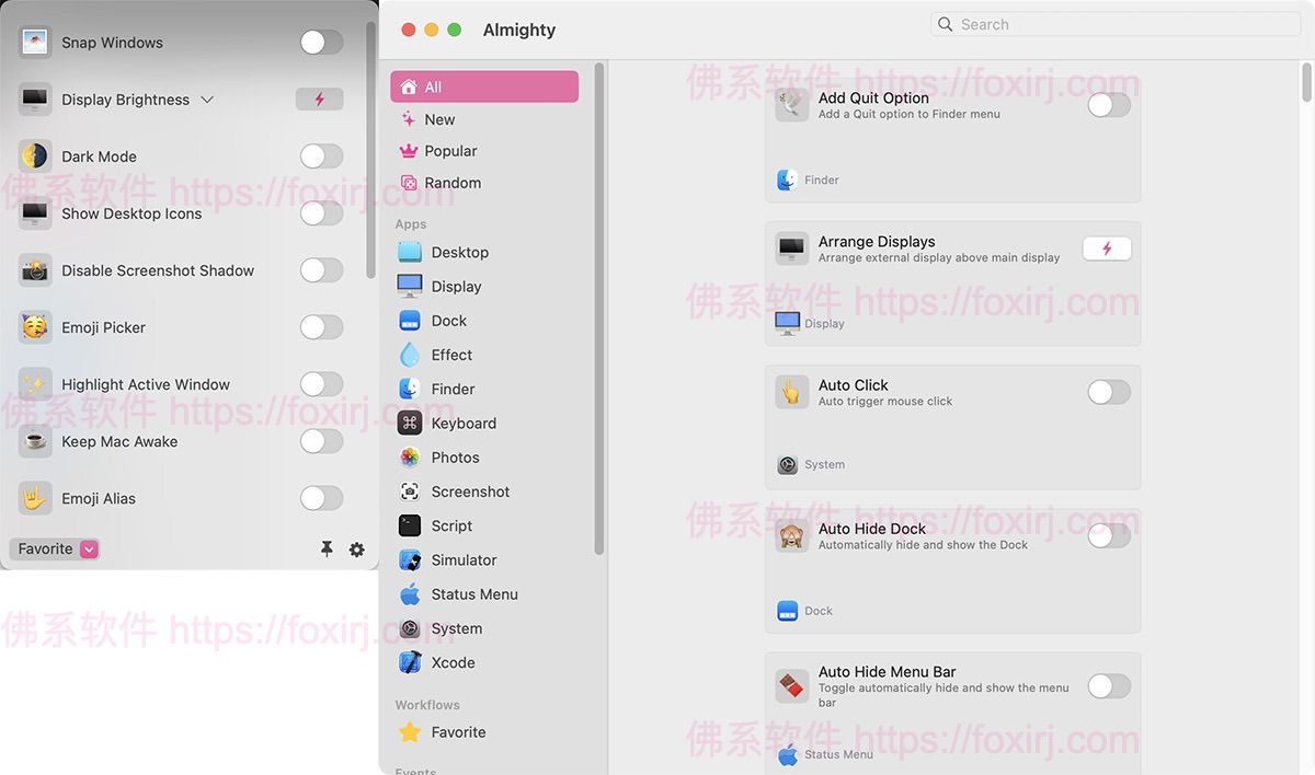 Almighty包括许多Mac调整和额外的实用工具,以提升您的Mac体验。Almighty是一个方便易用的macOS菜单栏应用程序,提供了强大的mac配置。它简化了繁琐的设置,并允许我们通过冗长的Apple脚本或命令行进行控制。有了Almighty,所有强大的设置和实用工具都只需1次点击或切换即可使用。