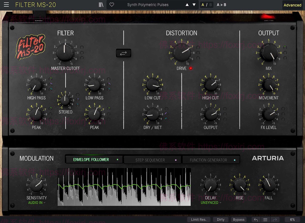 驱动和失真:Filter MS-20 提供了额外的驱动控制,可以增加输入信号的增益,从而在进入滤波器之前引入模拟饱和度和失真,用于创建更为强烈和突出的音色。