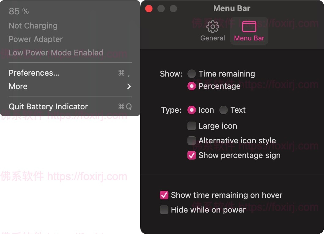 在菜单栏中显示剩余的电池时间和百分比。该应用程序具有一个设置,可以在连接电源插头时隐藏菜单栏图标,这在只关心使用电池时的电池时间/百分比时非常有用。