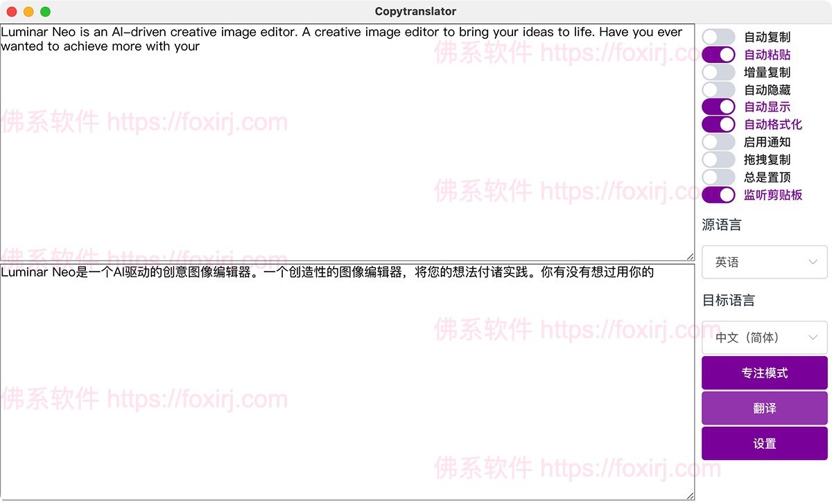 Copy Translator将自动识别复制的文本,并根据设置的源语言和目标语言智能翻译。如果您复制源语言,它将被翻译成目标语言,复制的目标语言将被翻译成源语言。如果复制的文本既不是源语言也不是目标语言,就会被翻译成目标语言,在设置-切换界面可以关闭智能翻译。别担心,自动复制不会与此机制交互。