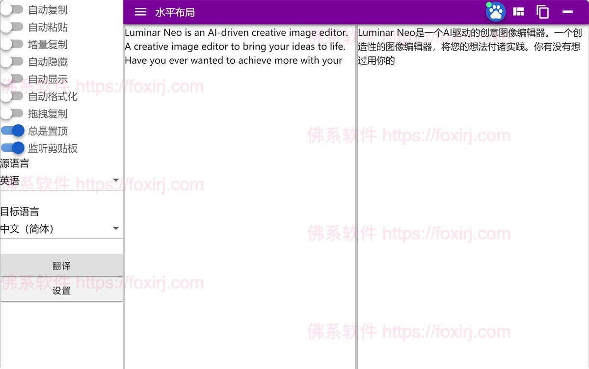 焦点管理模式进行窗口粘贴在顶部(Y坐标小于0)| 粘贴在左侧|粘贴在右侧,失去焦点问题后会自动隐藏。可以根据设置,翻译后自动分析显示。所谓的焦点丢失是指原始焦点处于发展焦点模式,然后使用鼠标/键盘点击选择其他系统软件,焦点移动。