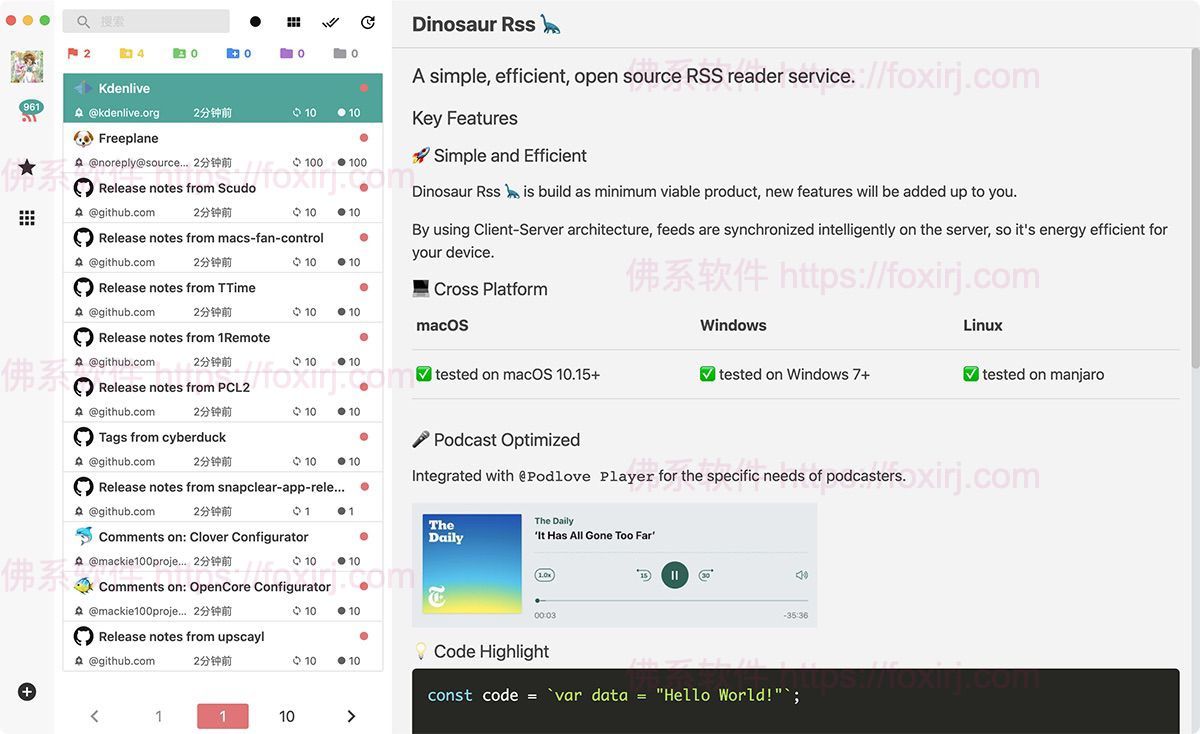 Dinosaur Rss 是一款简单、高效、开源的 RSS 阅读器服务。构建为最小可行产品,新功能将添加到您身上。通过使用客户端-服务器体系结构,源在服务器上智能同步,因此对您的设备来说是节能的。