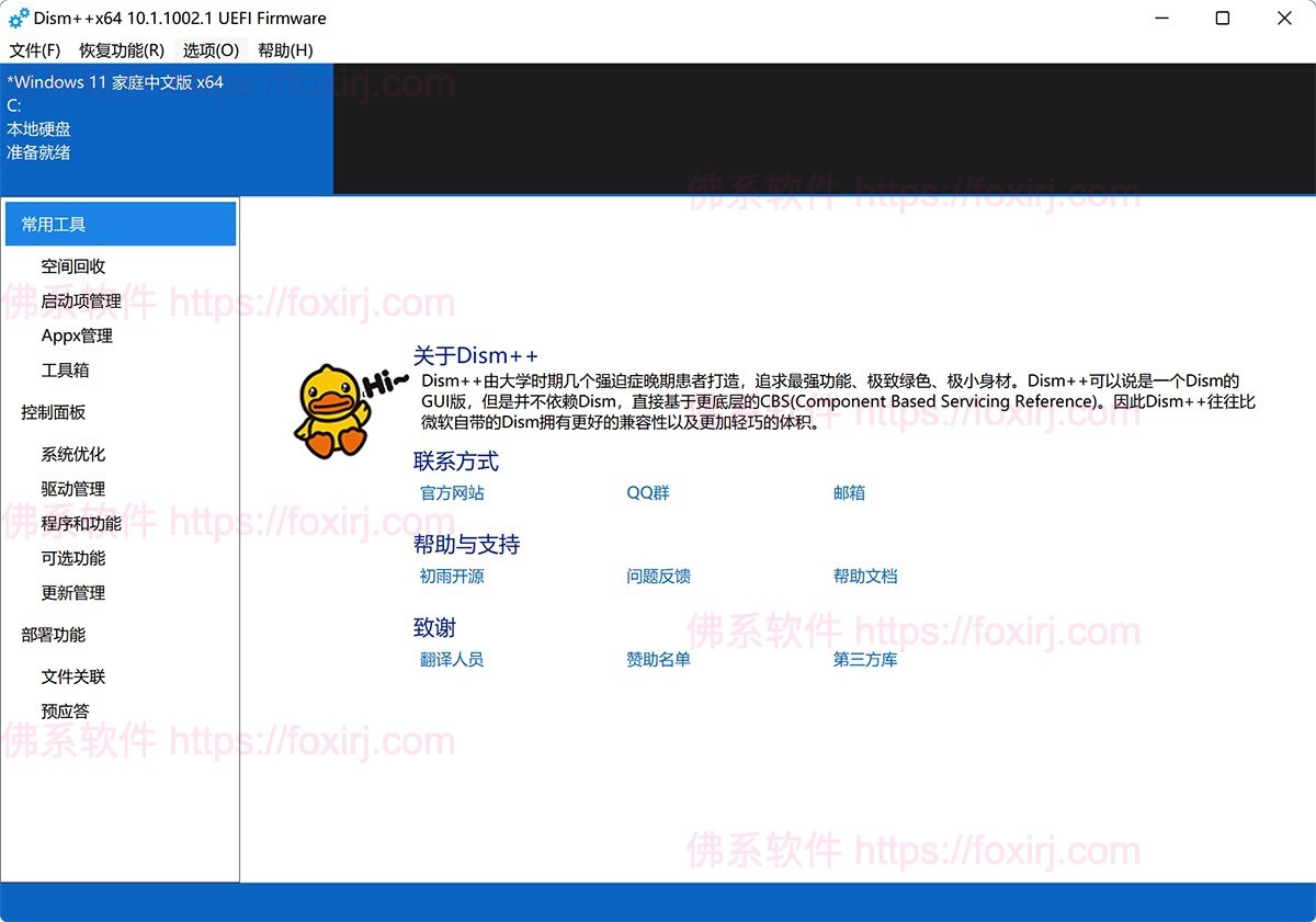 Dism++ 以前称为 Windows 更新清理工具。 做GHO系统打包的朋友应该都知道这个软件。 Dism++可以说是Dism的GUI版本,但它并不依赖于Dism,而是直接基于下层CBS(Component Based Service Reference)。 dism功能强大,系统更新后清理系统,安装更新不再为容量而苦恼! 在不简化系统的情况下,CompactOS可以节省33%的空间,而且系统热备份和热恢复不需要对等! 也就是说,它开箱即用,没有广告或后门。