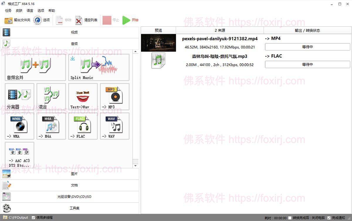 文件格式转换:格式工厂可以将各种音频、视频和图片文件转换为不同的格式。例如,你可以将MP3音乐文件转换为WAV、OGG或AAC格式,将视频文件转换为AVI、MP4、MKV或FLV格式,以及将图片文件转换为JPG、PNG或BMP格式等。