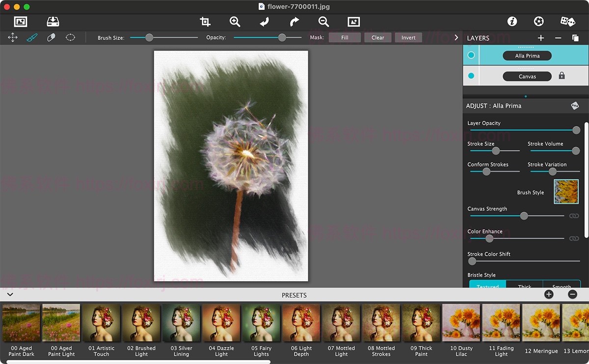JixiPix Artista Impresso是一款产品性能可以安稳、功能更加强大的油画镜像软件,软件技术操作方法简单,能够将一般的相片信息或者通过图片转换为油画发展作用,看上去都是非常需要具有文化艺术感,并且我们能够与Photoshop,Elements,Lightroom等图片数据处理分析软件设计兼容,兼容win、mac等操作控制系统,新版本的Artista Impresso带来了一个全新的笔刷和作用,并且不断修正了部分BUG。