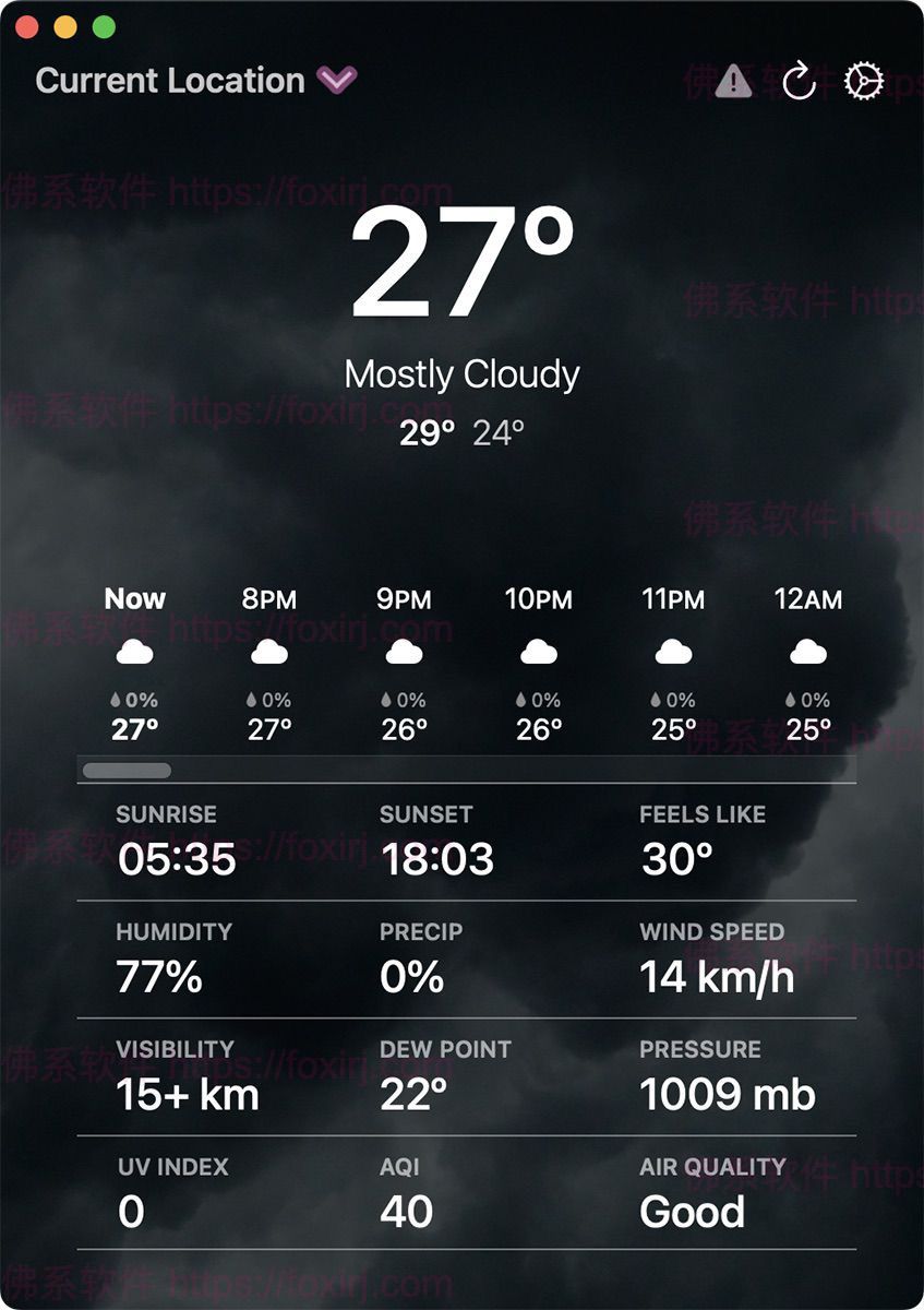 Outside 可以为你显示当前的天气情况信息,还可以提供未来几天的天气预报。 它使用您的Mac的位置精确定位您所在地区的确切天气预报。