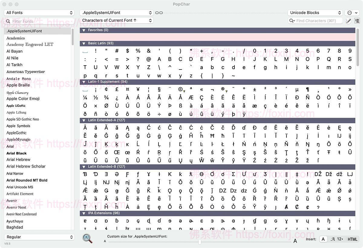 细节决定成败 使用 PopChar,您还可以详细查看字体 - 查看字体预览,查看给定文本片段在某种字体中的外观,以及打印漂亮的字体表。PopChar还支持连字。
