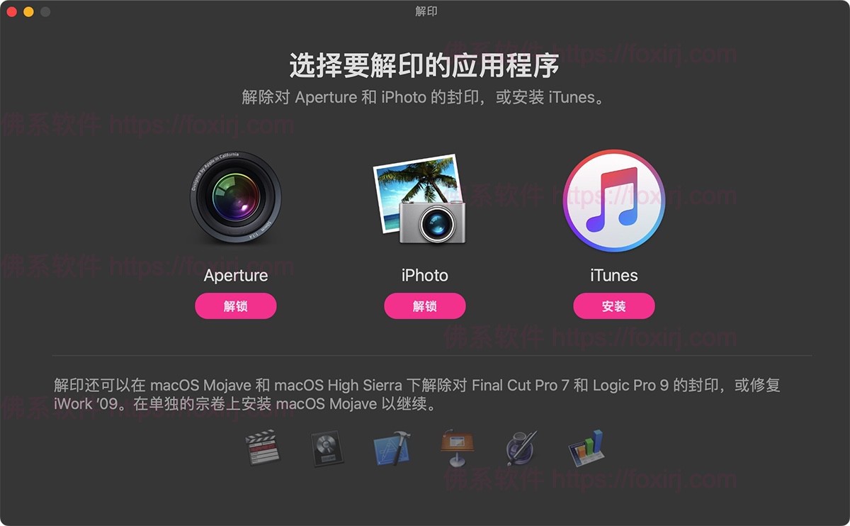 - 除播放视频、导出幻灯片、照片流和 iCloud 照片共享外,所有 Aperture 功能都应可用。
