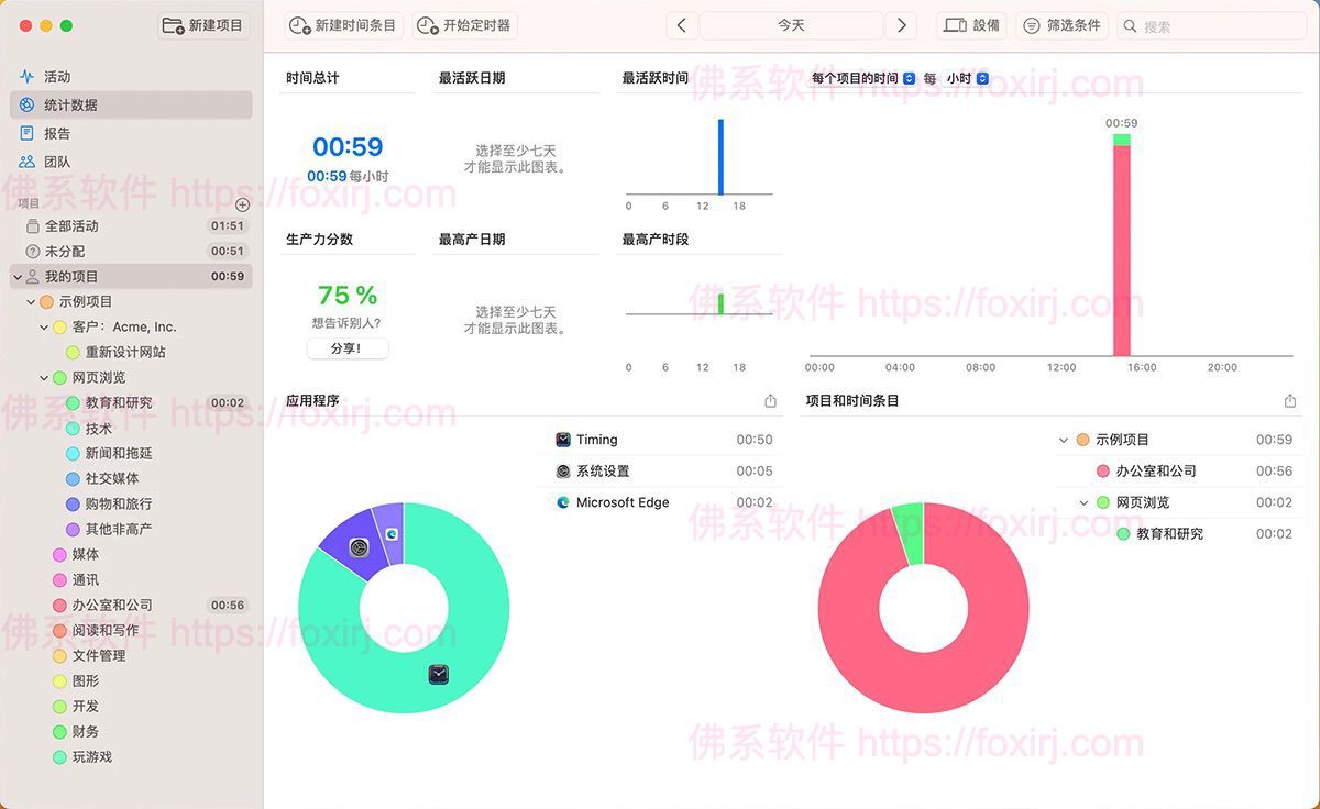 自动时间跟踪:Timing能够自动跟踪您使用电脑上各种应用程序和网站的时间,无需手动输入时间记录。这方便用户准确地了解他们如何花费时间,并发现时间管理上的问题。