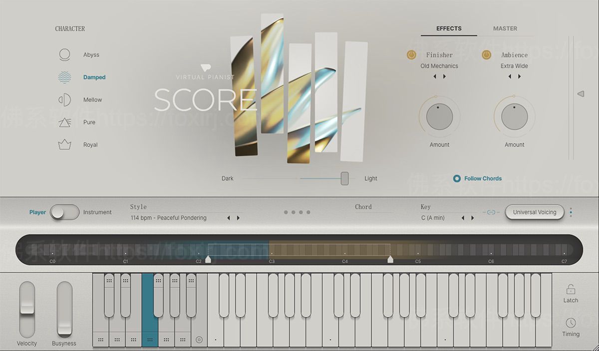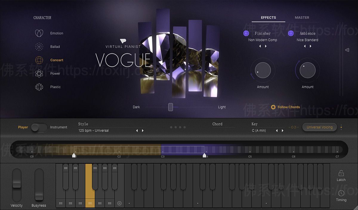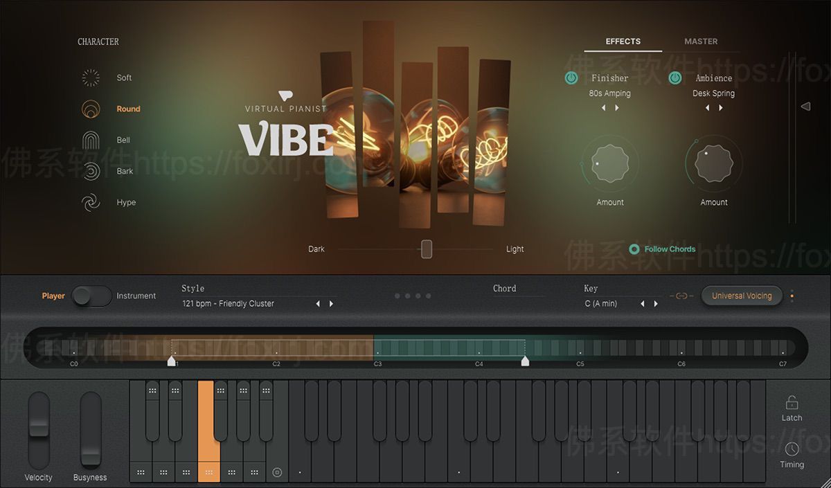 在乐器模式下,Virtual Pianist 兼作完全可弹奏的钢琴,因此您可以用我们原始的钢琴模型以及极具创意的 Finisher 和 Ambience FX 来装饰您的天才。