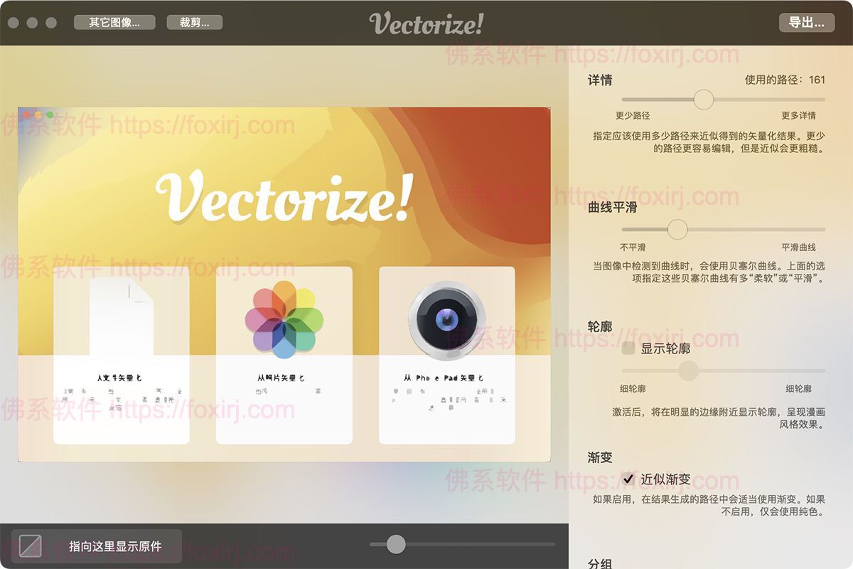 Vectorize!是一个完美的工具,可以快速轻松地将任何像素图形转换为分辨率无关、可伸缩的矢量格式,不仅适用于Mac,还适用于iPhone和iPad。无论您想要转换什么,比如低分辨率的JPG标志、漫画、草图,甚至是完整的照片,Vectorize!都可以将您的像素转换为矢量图形。