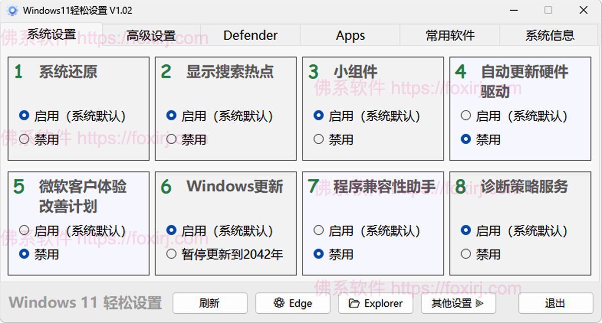 • 系统设置优化:用户可以通过该工具一键关闭系统更新、禁用defender、卸载系统自带应用、禁止浏览器自动更新等。