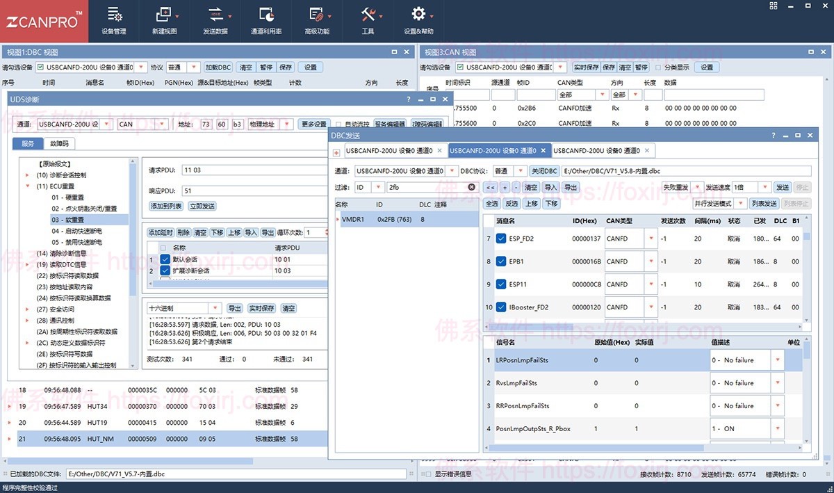 工具栏:包括的功能有设备管理、新建视图、发送数据、通道利用率、高级功能(触发配置、数据统计、数据回放、实时曲线分析、自动化测试、波特率计算器、GPS轨迹、车辆识别码、UDS诊断、ECU刷新、LIN数据收发、扩展脚本等)和工具;